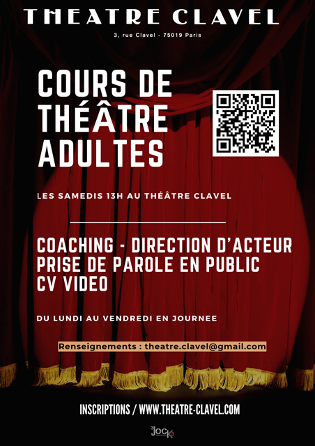 Un plateau de 60 m2Informations, réservations : www.theatre-clavel.comAdministration/ programmateur : Sébastien Pimont Adresse : 3, rue Clavel - 75019 Paris Accès : Métro Pyrénées, Bus : ligne 26 arrêt "Pyrénées-Belleville" Venir en voiture : Se garer Téléphone : 09 75 45 60 56 Contact mail : theatre.clavel@gmail.com Prix des spectacles adultes : voir rubriques : Tout public Prix des spectacles jeunes public : 9 € tarif unique (Centre loisirs 5,50 €) possibilité de réservation en ligne sur notre site rubrique jeune public. Les tarifs jeune public incluent un droit de garde de 0,50 €. Fiche Technique du théâtre Clavel Plan de feu du théâtre Clavel Logos/Typographie/QR Code Clavel |